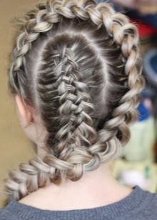 - When creating this hairstyle was used French spikelet technique. Horizontal braids in the upper and lower parts of the head are made using the same technology. Each individual pigtail starts from the top and bottom points located at the same distance. The connection of the braid into one solid tail occurs on the left side and is fixed with the original hairpin. With this hairstyle, you can go to any holiday event, for a walk or to visit.