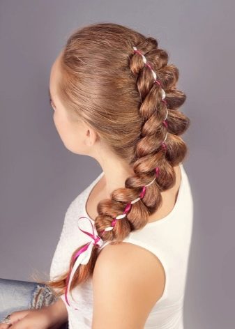 No modern mother will send her child to school or kindergarten with ordinary hair weaving. Be sure to add various decorations, hair clips, ribbons, elastic bands. In addition, there was a huge variety of ways to weave braids, for example, French technology, braid around the edge of the head. The most difficult option is to make a braid of four strands.