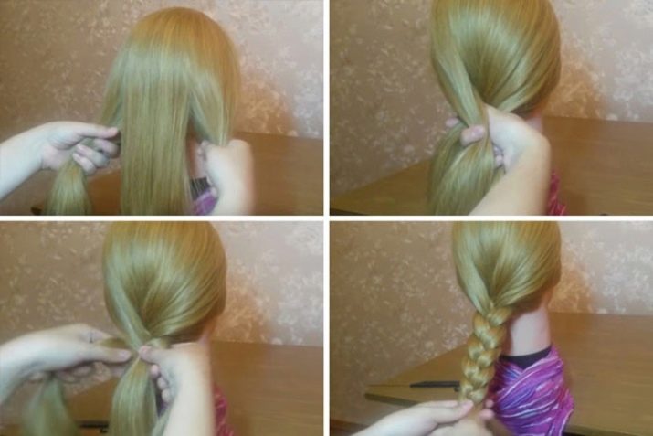 - A thin curl is separated from the right strand of the tail and transferred to the left side. A small curl also separates from the left strand and is shifted to the right side. According to this pattern, weaving occurs. It is very important that the detachable curls of the strands are of the same size. At the end of the hairstyle, the tip of the tail must be fixed with a regular rubber band.