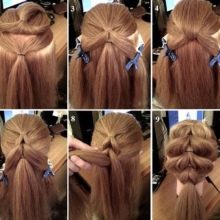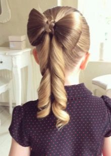 - The original version is a bow made of hair. At first, a high tail is formed on the crown, but at the end, the hair does not stretch out from the elastic completely, but form a loop. We divide it in half, in the role of a separator we use that part of the hair that was never passed through the elastic - we throw it from front to back and fix it with invisible hairpins.