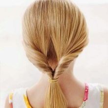 - A multi-layered ponytail is an option for girls with very long hair. Initially, the hair is collected according to the principle of a classic tight tail, but with the help of one of the strands, the elastic must be carefully wrapped, masking, and stabbed under the tail. Over the entire length of the hair with a uniform step of 5-10 cm, several more elastic bands are sequentially tied, each time pulling the hair a little from under the last elastic at this moment to increase the volume.