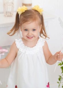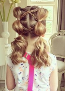 - Medium length hair already offer a wider range of solutions. Pigtails here can be made more thorough, they can weave ornaments like ribbons. If necessary and if there is time, parents can curl the child with curls or stab them.