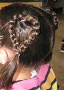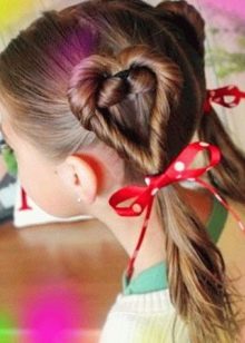- Side hearts - hairstyle option for those to whom a parting is permissible. The hair is divided into two parts in the middle, on each side a little behind the ear and a little above it is done on the tail. The main part of the hair is pulled through a small depression near the base of the gum, after which the hair mass is divided in half, forming two separate bundles, from which two sides of the heart are formed. Below, the free part of the hair is left to hang down, making out the tip of the figure with a bow, after which the heart is attached with hairpins in the place where it is supposed to be all the time. In the same order, all of the above is repeated on the other hand.