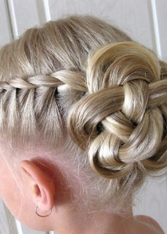 - A bunch of pigtails - An option for those who like to braid their hair, but want to do it more original than usual. To begin with, an ordinary low tail is formed, but after that it is divided into several equal parts - the more they are, the more impressive the volume will ultimately be. A separate small pigtail is made from each part, after which they are already intertwined, forming a large braid, and tied with elastic at the end. After that, a large braid, as it were, is wound once more around its base, and now it can be fixed with hairpins and decorated with flowers.