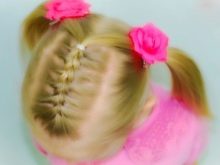 Comb your hair. We separate the strand of the hat zone and fix it with an elastic band. Then we divide the tail that we got into two parts. We braid pigtails, while weaving hair from the temples, we fix it. When both sides are ready, tie them with an elastic band. We catch a hairpin. Our simple hairstyle is ready, and the parents and the child are happy!