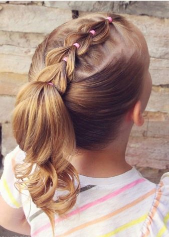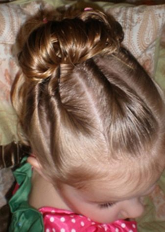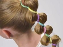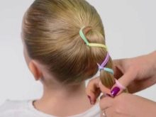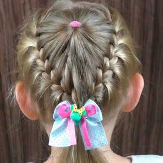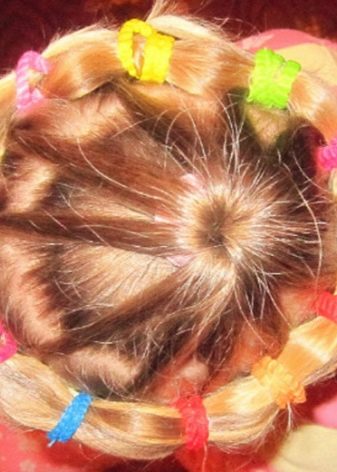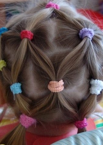 Comb your hair. We divide them into 3 parts to the middle of the head and fix. Divide the first part in two and tie the tails. Then we divide these 2 tails in half and, following the same principle, tie 4 tails. We are working on all this with the third part of the hair, there should be 6 tails. At the end we tie a bundle (if desired, the same “operation” can be worked out with a ponytail). Our simple hairstyle is ready, and the child is happy and beautiful in the kindergarten!