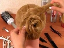 Comb your hair. We make an even parting in the middle. We tie two high beams. Take one tail and braid the braid. During weaving, it is necessary to stretch one side of the braid. When we finish, we bend the end and fix it with an elastic band. We do the same thing on the other hand. Now we take the pigtail and twist it into a circle so that the side that we pulled out is on the edge. Now apply our rose to the head. We fix it with studs (first in the middle, and then from the edges). We do the same thing on the other hand. Our interesting, fashionable and fast hairstyle is ready!