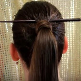 Comb your hair. Tie a high bunch. Now insert the stick (pencil) under the eraser. Divide the bundle in half and hook these two strands at the top of the stick. We fix from the bottom. Again, divide the tail in half and do the same. What remains is braided and fixed. Now you can add jewelry and remove the wand.Our butterfly is ready to sit forever on your little flower, flapping its wings!