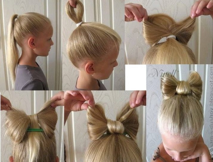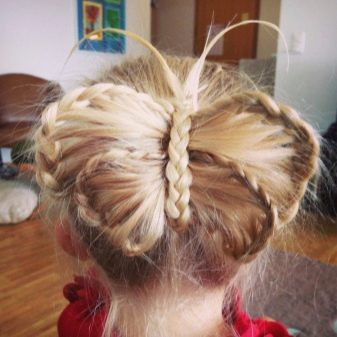 Comb your hair. We tie a high bundle with a large rubber band. We take two locks from above and with an indent of 5-8 centimeters we fix with an elastic band. Now we pin the places of fixation with studs to the beam. Our bow is ready. We take two strands of medium thickness from the tail and braid the braids (these will be the tails of our bow), fix with rubber bands. In conclusion, you can attach a beautiful hairpin to a bow. A cute and elegant hairstyle is ready. Everyone is happy with the result.