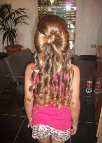 Comb your hair. We parted in the middle and on the sides. We take one strand (the rest can be fixed for a while so as not to interfere) and tightly wrap it in the middle. We fix the resulting curl. Now let's do the same with the rest of the strands. Next, we tie a bundle. The child is assembled, and in time this hairstyle did not take so much.