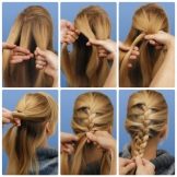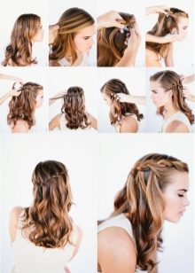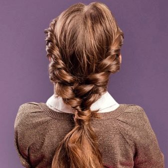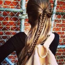 Fast pigtails, such as a fishtail, are also considered relevant. First of all, the hair is treated with light foam or mousse, and then separated by a direct parting. Then, on the right side, one curl is thrown to the left side, and on the left, in turn, to the right. Alternation of the lock is carried out until the free hair ends.