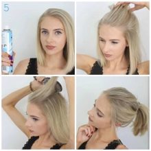 In 5 minutes, you can make light and beautiful hairstyles, the successful appearance of which will depend not on the amount of time spent, but on the phased implementation of the instructions. This may be a variation of the usual tail. Hair is combed in the face to achieve the required volume, then collected on the top. The small strand below is detached and used to wrap around the elastic. In another variation, you can make a low or, conversely, high tail, and then, I use a curling iron, to form an additional volume next to the elastic.