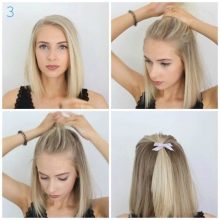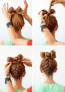 Feminine and bright hair can be considered hair bow. The first thing on the top is the tail from a part of the hair, but not until the end, to get a bun. Next, the design must be divided in half and stretched to form a bow. The tip of the hair rises and throws through the elastic, creating the central part of the hair bow. The whole hairstyle is fixed with the help of invisibility. The remaining hair can be curled with curls.