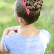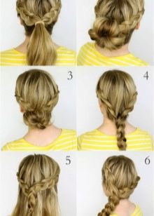At the prom, it will be most appropriate to look either beautifully styled loose hair or elegant adult styling. For example, a bunch with weaving elements. First of all, the whole pile is divided into upper and lower parts. The upper one is transformed into a neat bundle, and a braid is woven from the lower one, which will later braid the structure. Previously, you can comb the hair on the top to achieve a larger volume, and at the end it is necessary to hide the ends of the locks at the base.