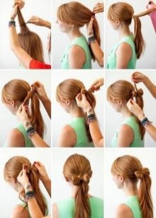 At the end of the hair should be fixed with an elastic band, on top of which you can wrap a lock of hair. To give the image a slightly relaxed look, you should slightly fluff the hairs.