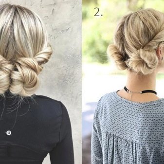 Natural or artificial hair can be stabbed into a beautiful wavy bundle. For this, the hair is divided into left and right parts, after which two tails are formed. They should be located closer to the parting, lower than the crown. Each tail is twisted into a tourniquet, which is fixed at the bottom with a transparent elastic band. Both parts are slightly twisted together to form a beam.