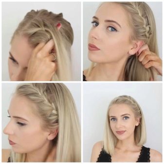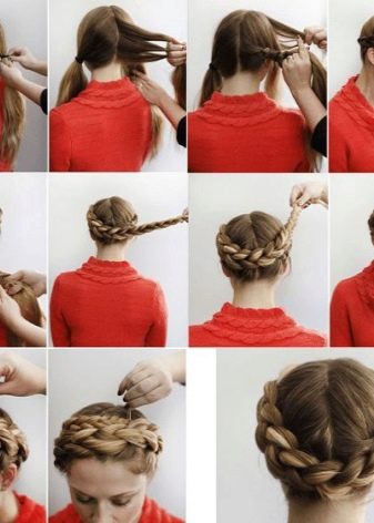 Classic braids can be transformed into an elegant half-crown, which is appropriate to complement the strict image. A lock is separated from the right side of the hair, which is transformed into a braid fixed with a thin elastic band. The same actions are carried out on the left side of the head. Both braids are laid back so as to form a half of the crown, and are fixed by invisible. If the tips stand out ugly, then they can be removed under a braid.