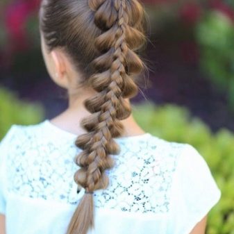 On long hair it looks very beautiful cascading tail. Initially, two locks of medium thickness are collected in a tail-malvina with a thin and invisible gum. A loop is formed in the hair over the assembly place, the end of the tail is passed into it and everything is again tightened. Repeat this step with other strands 3 to 7 times.