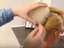 We make a very high tail. Then we throw it forward. With a roller, we stab the base of the tail. Next, we fasten the roller with an elastic band, and hide it under the hair. We bend the curls that remained under the roller and fix with a hairpin. Creation is ready, we only fix it with varnish.