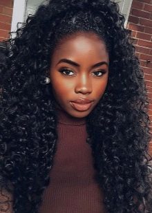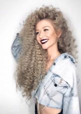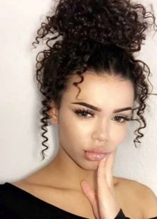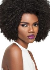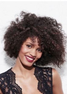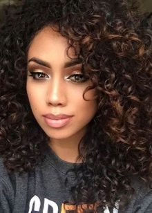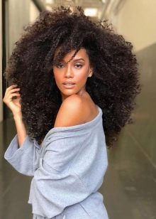 Beautiful and diverse styling can be created using African curls on long hair. Perfectly look just loose curls. A different effect can be achieved if you wind as close to the root as possible or with a slight indentation. High tail with African curls looks fashionable. A voluminous and magnificent hairdo attracts a lot of attention, so makeup with an emphasis on the eyes or lips will be useful. To create a harmonious image, do not combine such styling with tight clothes.