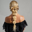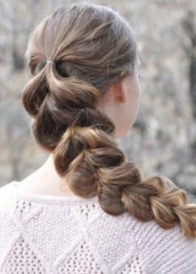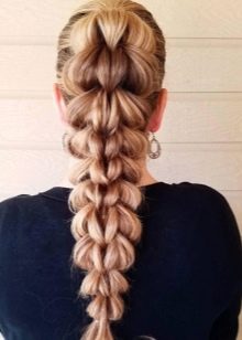- The result of the hairstyle should be one original tail with silicone rubber bands. To get more voluminous hair, you can slightly pull out the curls, as when braiding a braid. Thus, the hairstyle will be more spectacular and solemn.