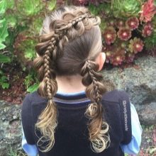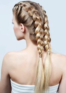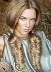 You can still simply braid on the top of the head to the middle of two spikelets, fix each of them with an elastic band, and leave the remaining hair loose. A good solution in this case will be the interlocking of hair from the two remaining tails using the fishtail technique or harnesses.