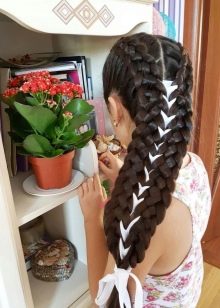 Such weaving is more suitable for children. To beautifully finish it, it is recommended to tie bows.