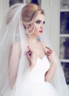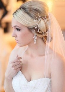 - Another fashion trend is a narrow veil, consisting of one layer of material. For this, it is necessary that the hair be raised up or pulled into a classic bun so that the fabric fits under it. To hold it, it is fixed with a few studs.