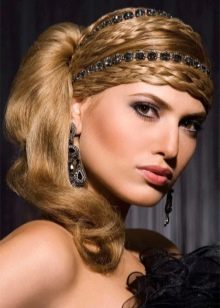 - The evening version of the hairstyle implies brilliance. Feel free to experiment and choose bright elements to create, including a diadem and hairpins with rhinestones.