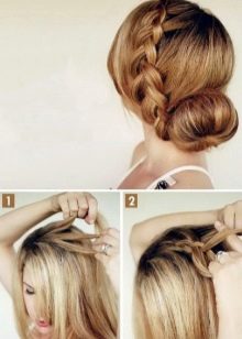 - starting from the temples, braid two braids on the sides, leading them to the back of the head; fix the whole result with an elastic band;