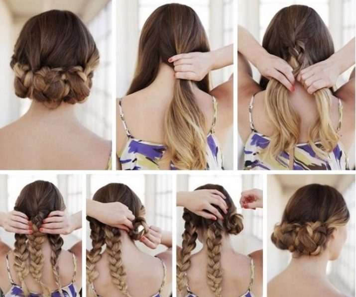 There are many options for a bun made of braided hair. There are simple and more complicated, but any option will take no more than 10 minutes. Raise hair in ponytail and secure with elastic. Divide it into 3 parts and braid each one. Alternately wrap the pigtails, fixing them with studs. Then make a small comb so that the hairstyle looks more voluminous. Divide the hair into six parts and braid the braids so that two are on the sides, two in the middle and two more on the back of the head. Take two pigtails from the back of your head and twist them, each lock with hairpins. Next, wrap around the bundle two braids from the middle, and then the outermost ones. It turns out a very delicate and romantic hairstyle.