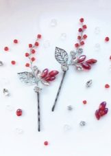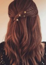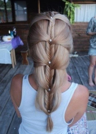 They are inserted into the middle of the braids. So created the impression that pearl threads are scattering in the hair. But you need to be sure that hairpins, rhinestones or pebbles will not bother you. Hairpins with flowers or colorful pebbles - an excellent hairdressing solution.