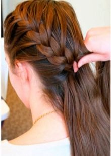 First, take a small curl, divide it into 3 equal parts. After a couple of steps of weaving an ordinary braid, start weaving adjacent strands on both sides so that they continue the curl that you weave. If you want to make a pigtail inside out, add strands in turn on each side. Put them under each other. So the braid will go up.