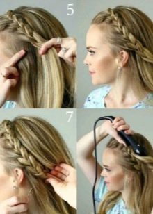 - Gather the back of the tail. On the front, on either side, we take three strands as close to the ear as possible and weave an ordinary braid. As soon as you move a little away from the ear, you can add extraneous strands from the remaining free hair. As soon as the braid reaches the opposite side, and all the strands are added to the rim, we complete the hairstyle with the usual three-strand braid.
