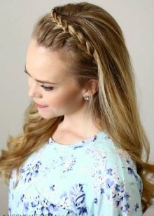 - Choose a strand close to the temple, which should be divided into three parts and start braiding the usual three-part pigtail (you should start with the strand that is closer to the face). That lock that turned out lower should remain below. Instead, use another one from the remaining hair. Continue, leaving this lock every time. Bring the braid to the other side of the face.
