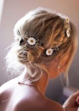 A “little wreath” of “fishtail” decorated with flowers is able to transform any hairstyle, including on short hair. A girl with such styling will look natural and easy, even if the hair color is far from natural.