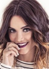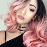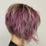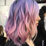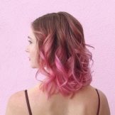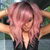 The basic tones of her image in pink and purple are not perceived as a natural shade, because all the hair in such a performance might seem overly defiant. The solution turned out to be simple: only individual strands were stained, which harmonize well with the main light brown color. At the same time, makeup, clothes, and even the lipstick of the girl fit perfectly into the overall color set, which makes the image holistic.