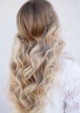 Slightly careless curls on long hair combined with dyeing of the tips give a striking effect. The girls in the photo are both princesses, and typical representatives of youth, and fashionistas.In this case, the style is chosen especially well: light tips go well with predominantly white clothes, and the bulk of dark hair suits both the shade of the eyes and the thin black stripes.