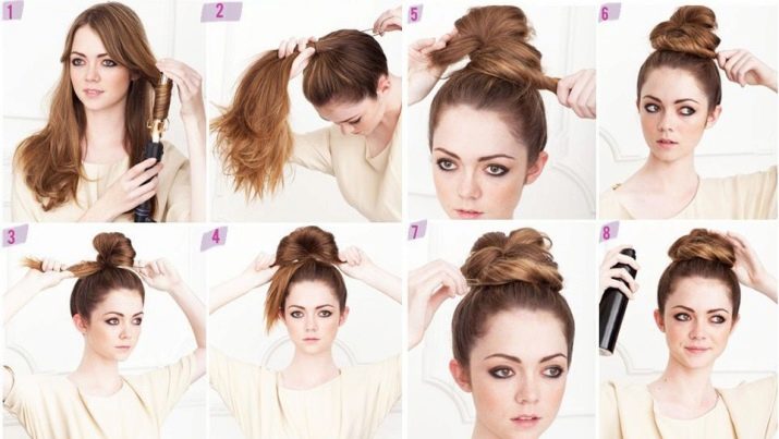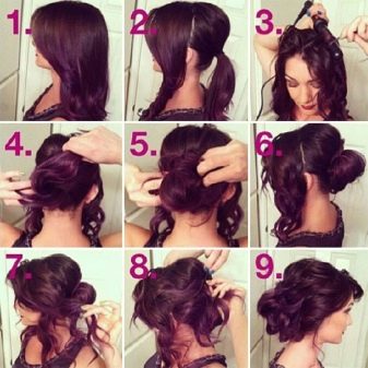 With an average length, you can make a beautiful high bunch with curls. Step by step hairstyle looks like this:
