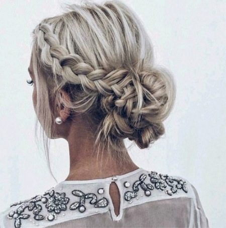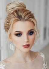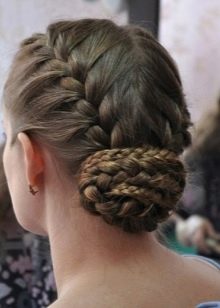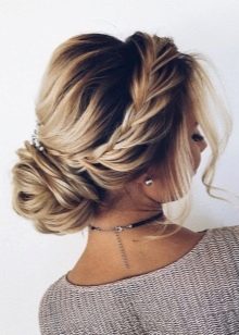 This type of beam is ideal for a wedding. It involves the interweaving of braids of various thicknesses. Pigtails are braided on the back of the head, crown and at the base of the hairline. The bulk, pre-wound into curls, is collected on the crown, and then braids are located around it. The design of such a hairstyle is negotiated with the hairdresser in advance, since it includes a huge number of options.