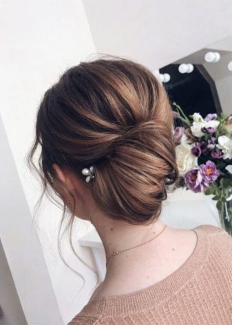 Despite the many opinions that a French bun cannot be made on short hair, There is a styling option that allows you to create a pretty similar hairstyle even on such women's haircuts. For these purposes, the curls will alternately twist on the back of the head, securing with studs in one place. All protruding ends are tucked in, and short hairs should be treated with styling products and secured with invisibility.