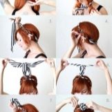 - A hairstyle with a bandage is distinguished by its simplicity and ease of execution. If you do not have a special dressing, then you can use a homemade one from a scarf. Divide the hair in half in the back, lay the scarf so that its ends hang evenly. Divide the hair in half again on one side, twist the tourniquet together with a scarf, and fix the end of the tail there. Do the same with the other side, connect both sides from above, connecting the ends of the scarf with each other. Twist the scarf, attach it to the head, slightly above the forehead, tie on the back of the head and hide the tips. Take a lock of hair from your temples and twist through a makeshift rim, twist so all the strands on both sides. Having reached the back of the head, twist the remaining hair, fasten with a couple of invisibles, sprinkle the hair with varnish to fix it.