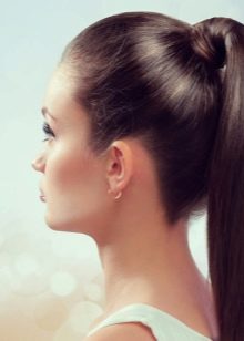 - Separate a strand of hair a little lower and tie it in a tail, lower the upper tail, tie an elastic band on it slightly below the level of the second tail, making a hole, stick out the lower tail, lift it and fix it with a crab;