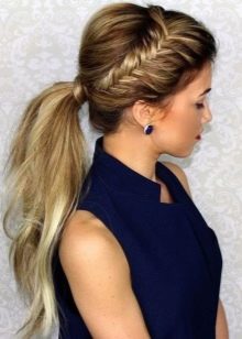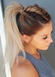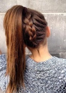 For another option, take a lock from the forehead and weave a spikelet, tourniquet or braid. Lift the remaining hair into a ponytail, tying it with an elastic band, wrap the weave around it, fasten it with invisibility. The third option is weaving from below.Comb all the hair back, take 3 thin strands at the bottom of the back of the head, and begin to weave a back or regular braid. Weave, moving up, add hair on the sides. Finish the weaving on the crown with a high tail.