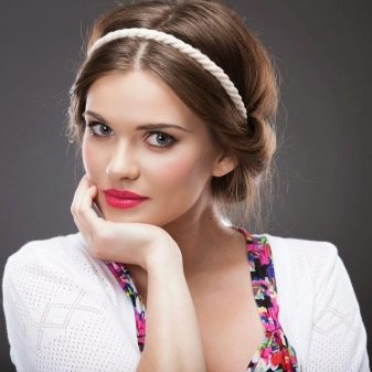 To use the woven rim (the principle of the Greek hairstyle), you need to put the rim on your head and turn the locks around it, first on one side and then on the other side. Headbands, like hoops, are different, made from various materials: rubber, fabric, plastic and even metal, decorated with artificial, ribbon flowers, stones and beads.