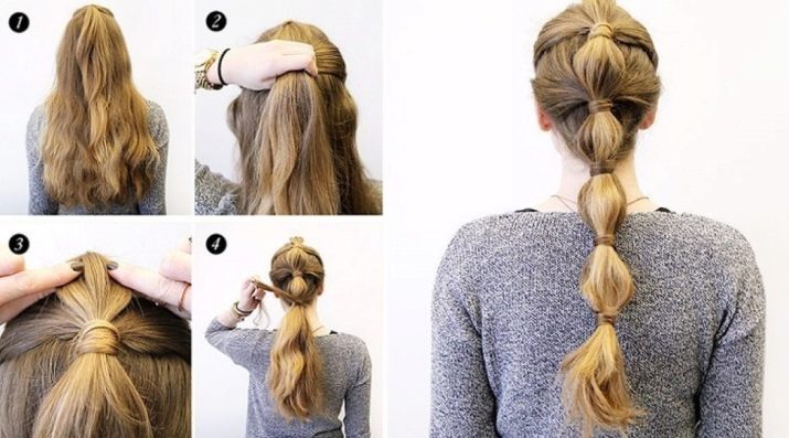 - Inverted tails: tie the tail with a simple rubber band, like on the “Malvina” hairstyle, then after making a hole above the elastic, turn the entire tail into it. Separate the hair from the back of the ear and tie the tail, including the upper, making a hole again, turn the hair. Tie the last ponytail at the bottom and also twist it. Fix the hairdo with varnish, the fluffy tail can be wound, and hairpins with pebbles can be inserted into the gum.