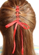 - Separate part of the hair at the back of the head and throw it over your face. It is necessary to fix the ribbon in the center with two invisibles. The ends of the product should be the same length.