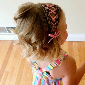 A small pigtail looks charming. Plaits on one side between the forehead and the temple. Performed like a spikelet. At the end it is fixed with a bow. The tips are curled on the tongs. This is an ideal choice for young women.