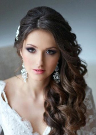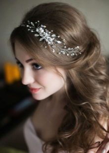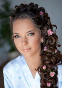 Trendy curls, carefully removed to the side, look much more festive and brighter if supplemented with suitable accessories. Most often, young ladies resort to the use of charming headbands, hairpins, cute flowers to decorate their hairstyles. No less attractive and gently similar compositions with curls look if supplemented with rhinestones, multi-colored beads, feathers or tiaras.