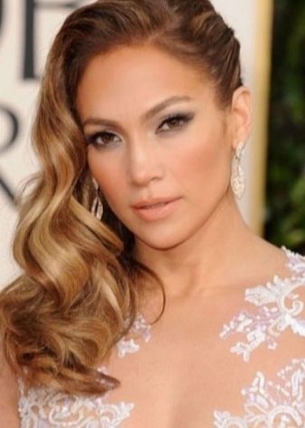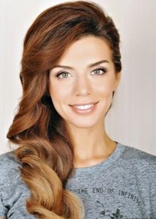Fabulous on girls and women looks hairstyle with wavy large curls, gathered from the head, and then put on one side. Particularly harmonious styling will look in tandem with a side parting. But you need to keep in mind that in this case, the temporal part of the opposite side will be maximally open.